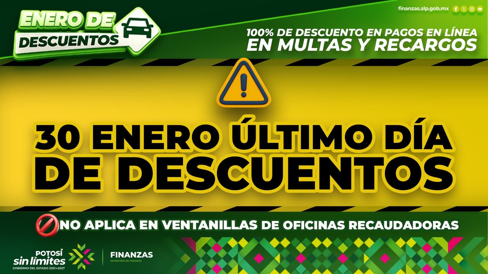 Por instrucciones del Gobernador Ricardo Gallardo Cardona, la Secretaría de Finanzas (Sefin) ofrece durante enero un descuento del 100 por ciento en multas y recargos de control vehicular para pagos realizados a través de WhatsApp. Esta acción forma parte de la estrategia Estatal de apoyo a la economía familiar y busca facilitar el cumplimiento de obligaciones fiscales de manera práctica y eficiente.