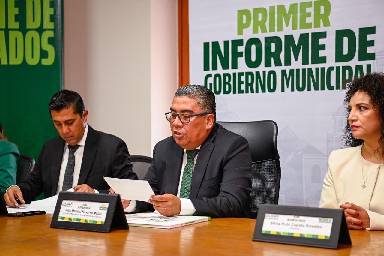En cumplimiento a la Ley Orgánica del Municipio Libre, esta mañana, el Alcalde Juan Manuel Navarro Muñiz, entregó esta mañana a las y los integrantes del Cabildo Municipal, el documento del Primer Informe de Resultados de su administración municipal de Soledad de Graciano Sánchez, en el que se da cuenta de las acciones realizadas que, hoy, han transformado al municipio.