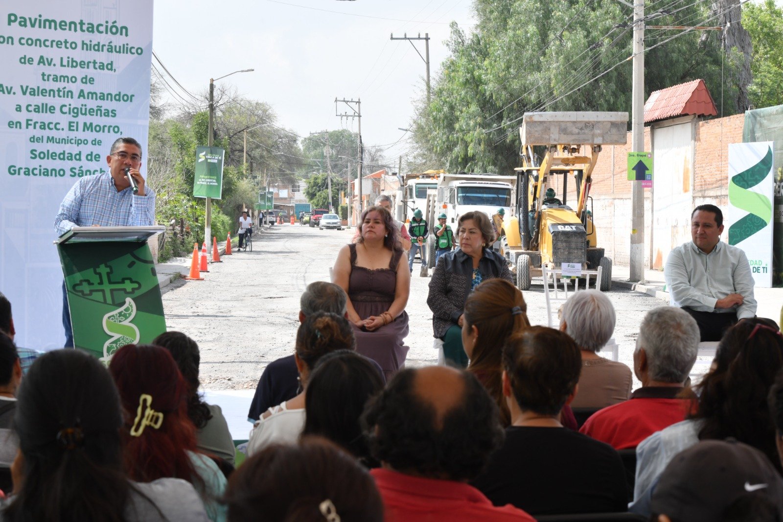 Juan Manuel Navarro Muñiz, Alcalde de Soledad de Graciano Sánchez, dio arranque a los trabajos de pavimentación con concreto hidráulico de la Avenida Libertad, en el tramo que va de Avenida Valentín Amador a la calle Cigüeñas, en la colonia El Morro, que beneficiará directamente e indirectamente a más de 26 mil habitantes, y representa una respuesta firme del Gobierno Municipal al compromiso de transformar vialidades deterioradas en espacios modernos, seguros y funcionales para las familias soledenses.
