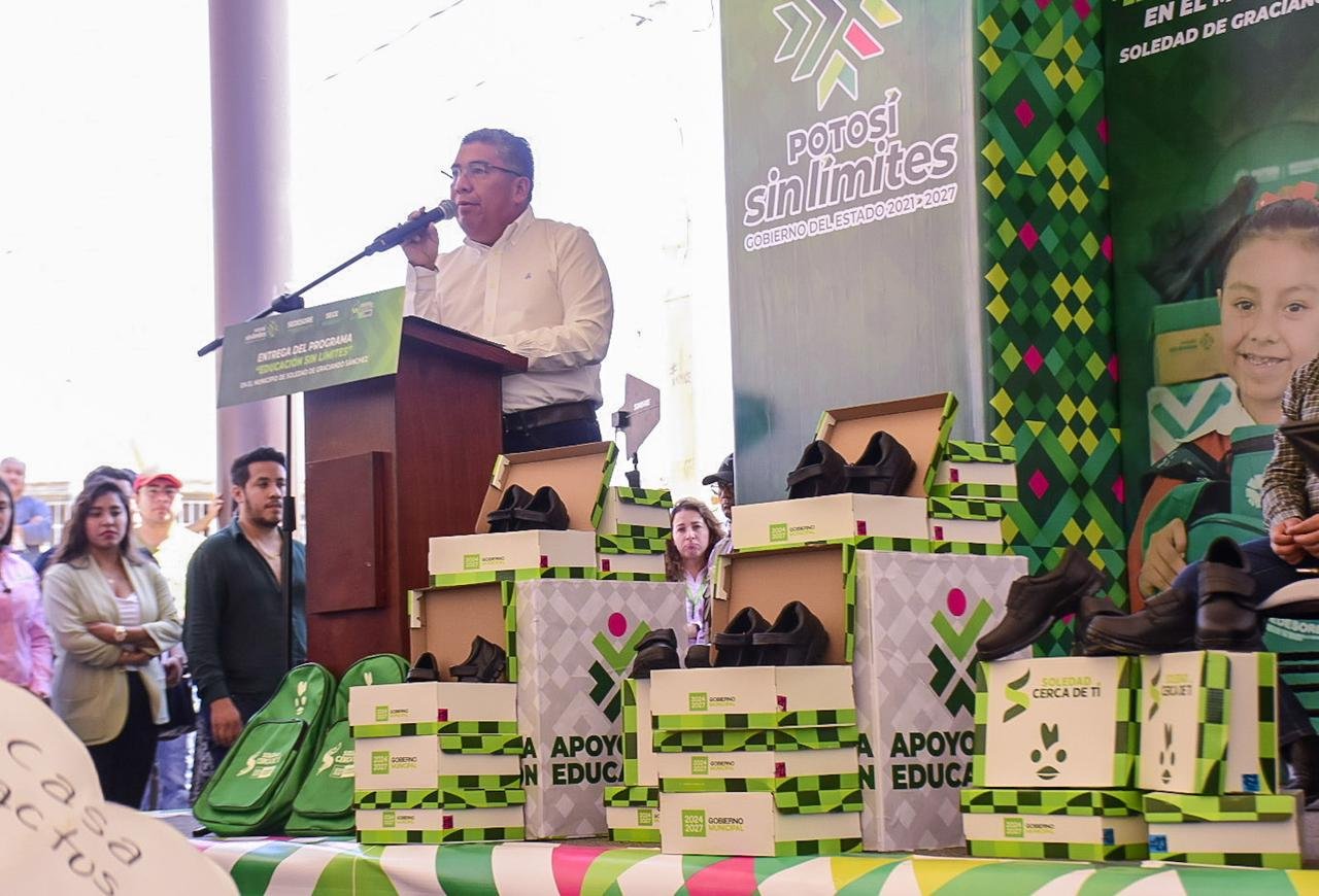 Juan Manuel Navarro Muñiz, Alcalde de Soledad de Graciano Sánchez, puso en marcha este día en la colonia La Sierra el programa municipal “Apoyos Escolares para Regreso a Clases”, que beneficiará a estudiantes de primarias y secundarias de todas las colonias del municipio con 20 mil mochilas con útiles y 13 mil pares de zapatos, gracias a una inversión municipal de casi 17 millones de pesos; la entrega se realizó en el marco del programa estatal “Educación sin Límites”, encabezado por el Gobernador Ricardo Gallardo Cardona, quien estuvo presente en el arranque.