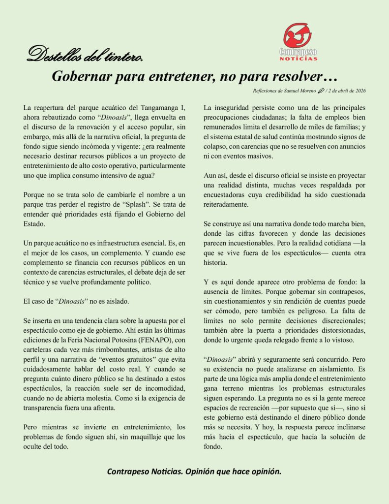 La reapertura del parque acuático del Tangamanga I, ahora rebautizado como “Dinoasis”, llega envuelta en el discurso de la renovación y el acceso popular, sin embargo, más allá de la narrativa oficial, la pregunta de fondo sigue siendo incómoda y vigente: ¿era realmente necesario destinar recursos públicos a un proyecto de entretenimiento de alto costo operativo, particularmente uno que implica consumo intensivo de agua?