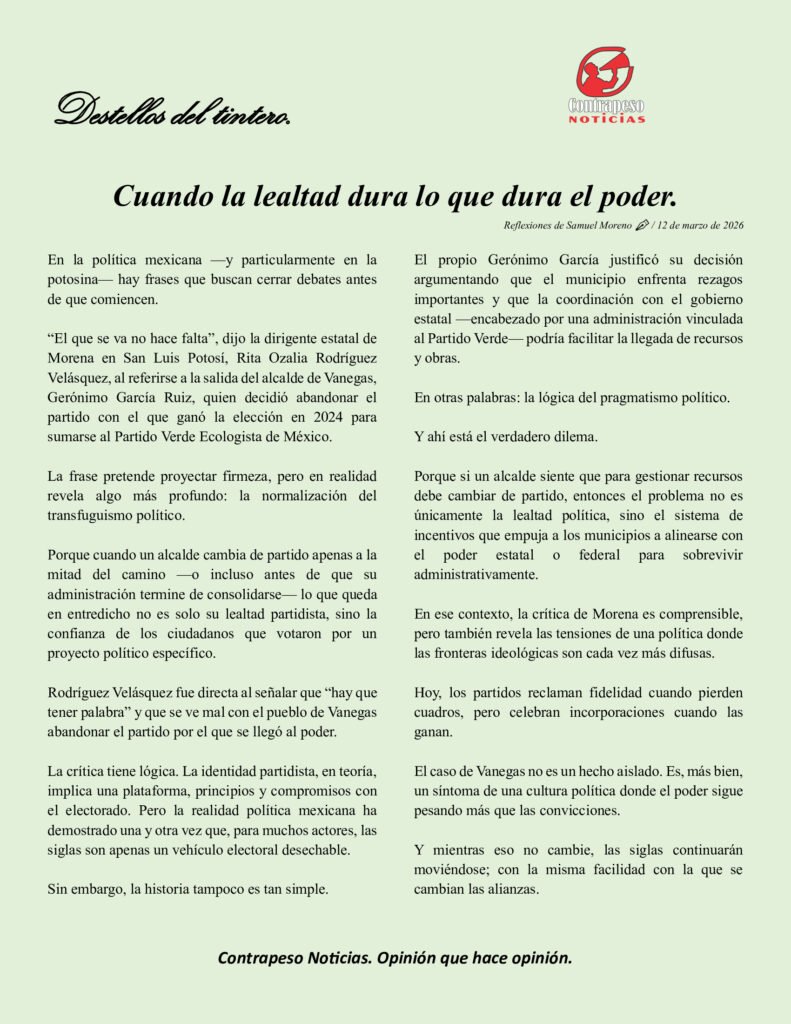 Porque si un alcalde siente que para gestionar recursos debe cambiar de partido, entonces el problema no es únicamente la lealtad política, sino el sistema de incentivos que empuja a los municipios a alinearse con el poder estatal o federal para sobrevivir administrativamente.