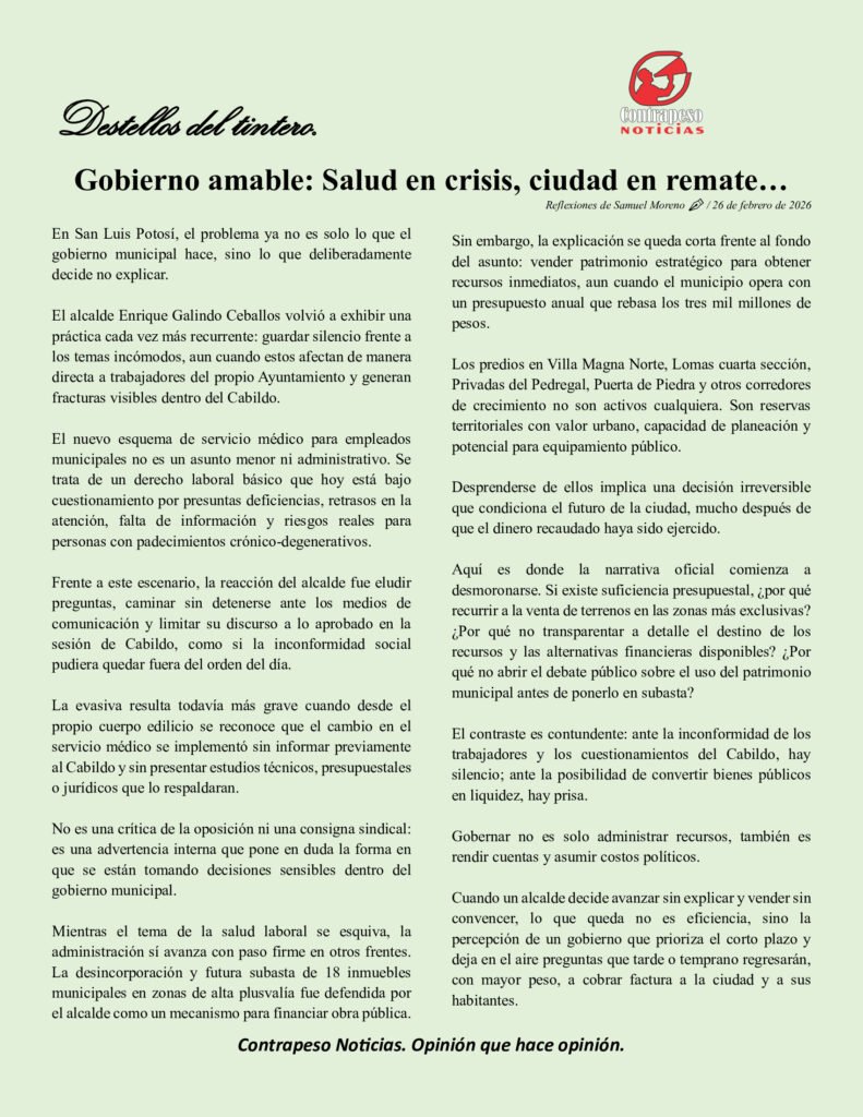 Cuando un alcalde decide avanzar sin explicar y vender sin convencer, lo que queda no es eficiencia, sino la percepción de un gobierno que prioriza el corto plazo y deja en el aire preguntas que tarde o temprano regresarán, con mayor peso, a cobrar factura a la ciudad y a sus habitantes.
