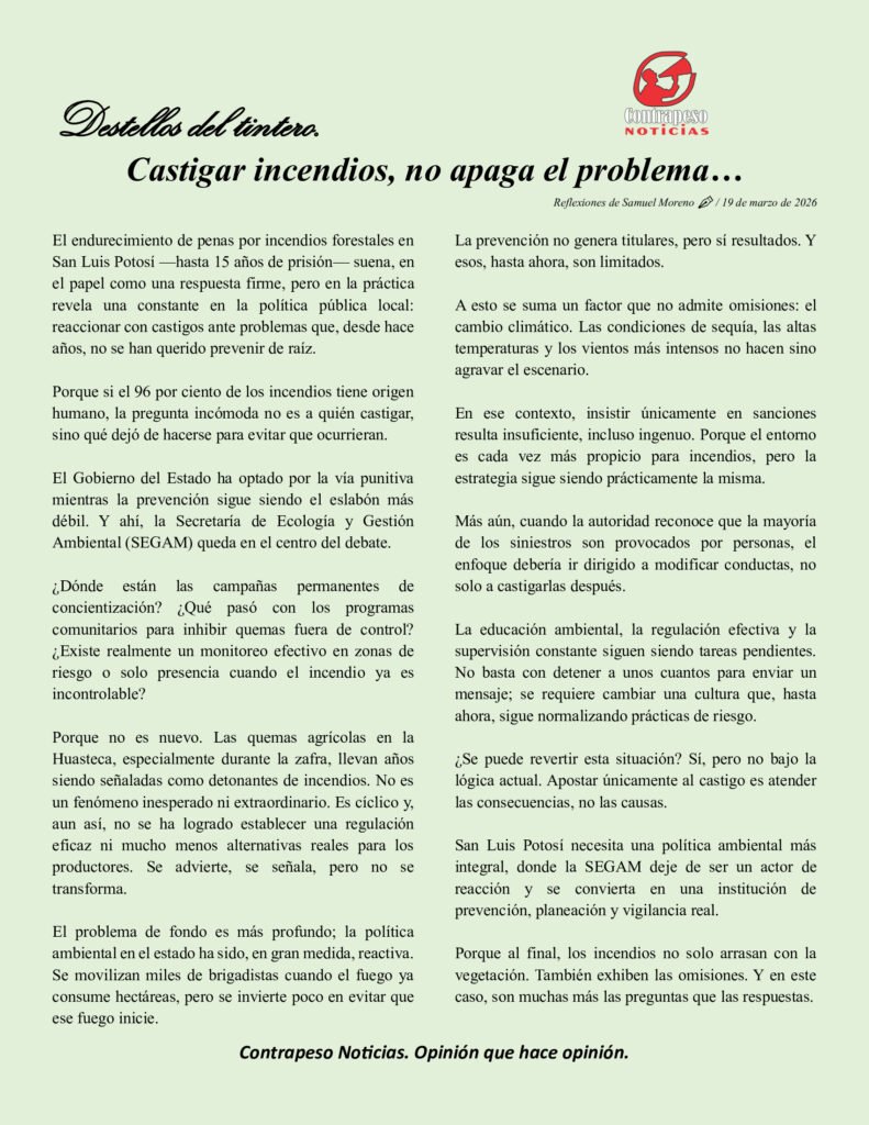 El endurecimiento de penas por incendios forestales en San Luis Potosí —hasta 15 años de prisión— suena, en el papel como una respuesta firme, pero en la práctica revela una constante en la política pública local: reaccionar con castigos ante problemas que, desde hace años, no se han querido prevenir de raíz.
