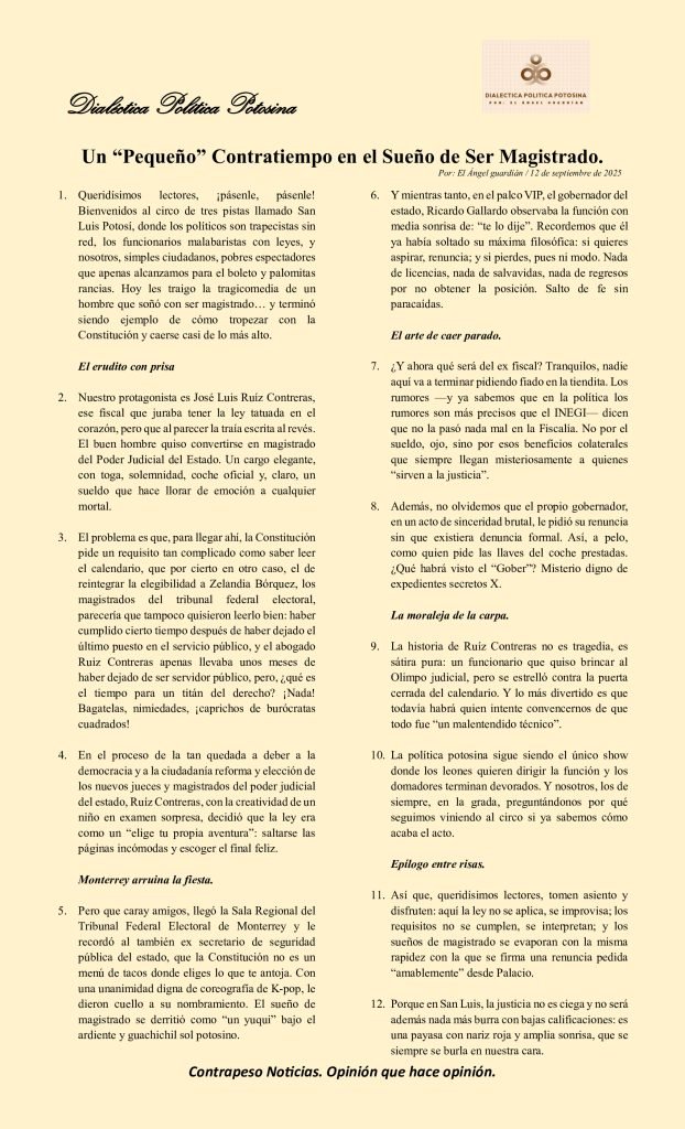 - Queridísimos lectores, ¡pásenle, pásenle! Bienvenidos al circo de tres pistas llamado San Luis Potosí, donde los políticos son trapecistas sin red, los funcionarios malabaristas con leyes, y nosotros, simples ciudadanos, pobres espectadores que apenas alcanzamos para el boleto y palomitas rancias. Hoy les traigo la tragicomedia de un hombre que soñó con ser magistrado… y terminó siendo ejemplo de cómo tropezar con la Constitución y caerse casi de lo más alto.