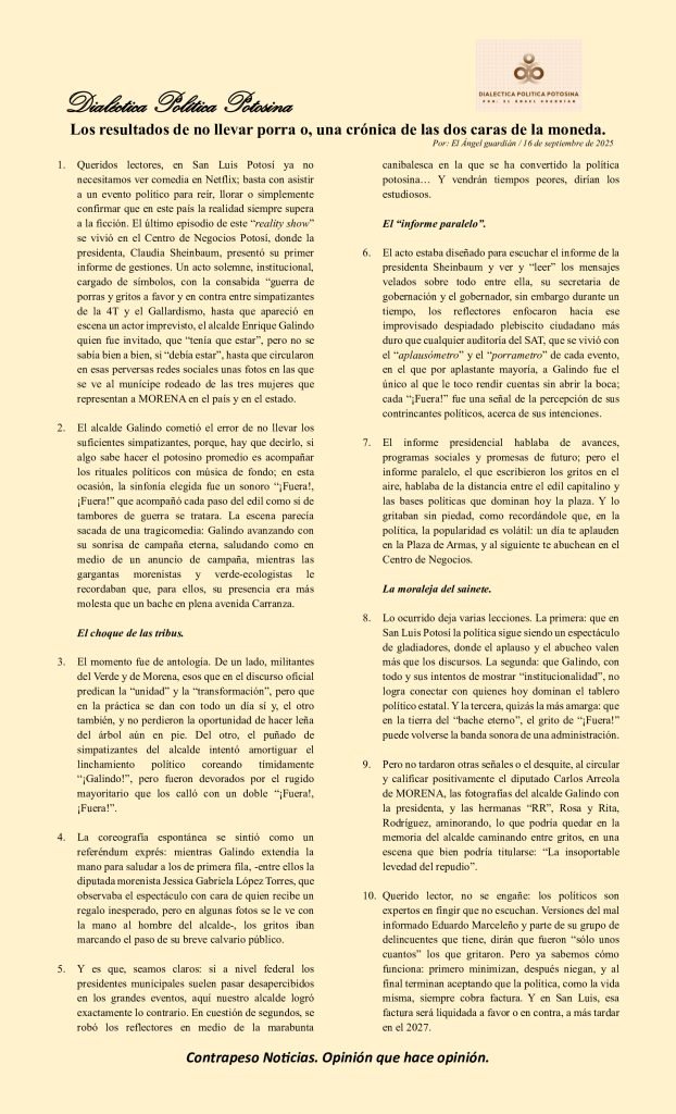 - Lo ocurrido deja varias lecciones. La primera: que en San Luis Potosí la política sigue siendo un espectáculo de gladiadores, donde el aplauso y el abucheo valen más que los discursos. La segunda: que Galindo, con todo y sus intentos de mostrar “institucionalidad”, no logra conectar con quienes hoy dominan el tablero político estatal. Y la tercera, quizás la más amarga: que en la tierra del “bache eterno”, el grito de “¡Fuera!” puede volverse la banda sonora de una administración.
