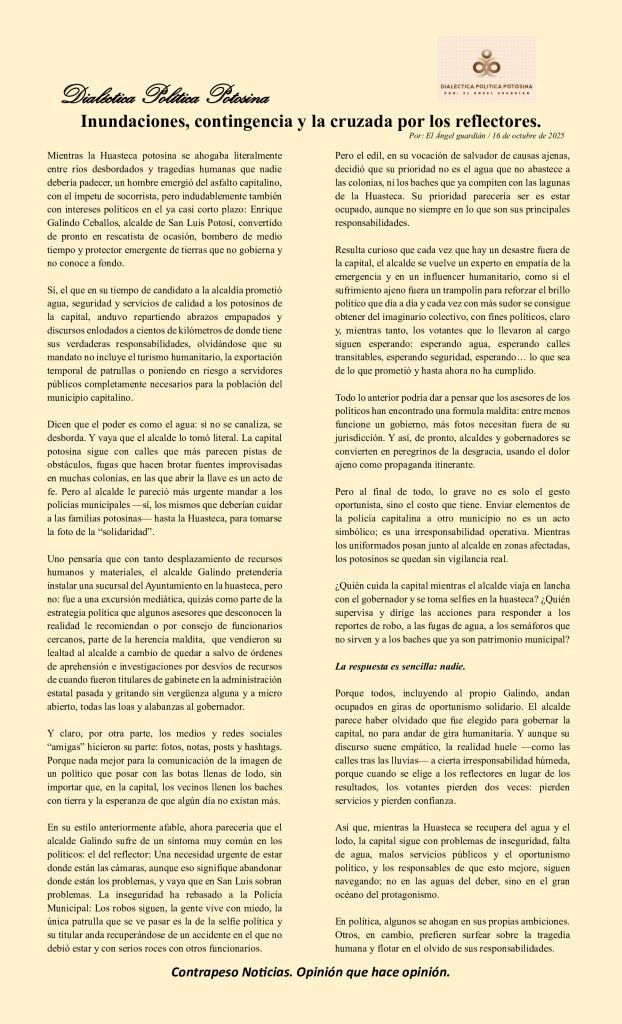 Mientras la Huasteca potosina se ahogaba literalmente entre ríos desbordados y tragedias humanas que nadie debería padecer, un hombre emergió del asfalto capitalino, con el ímpetu de socorrista, pero indudablemente también con intereses políticos en el ya casi corto plazo: Enrique Galindo Ceballos, alcalde de San Luis Potosí, convertido de pronto en rescatista de ocasión, bombero de medio tiempo y protector emergente de tierras que no gobierna y no conoce a fondo.