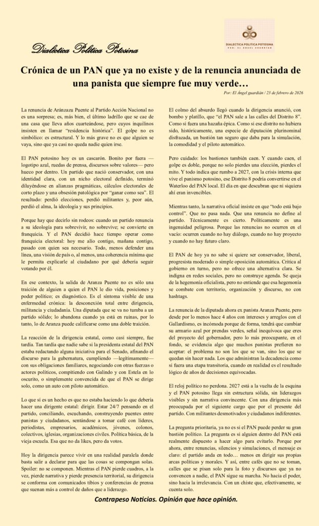 La renuncia de la diputada ahora ex panista Aranza Puente, pero desde por lo menos hace 4 años con intereses y arreglos con el Gallardismo, es incómoda porque de forma, tendrá que cambiar su armario azul por prendas verdes, señal inequívoca que eres del proyecto del gobernador, pero lo más preocupante, en el fondo, se evidencia algo que muchos panistas prefieren no aceptar: el problema no son los que se van, sino los que se quedan sin hacer nada. Los que administran la decadencia como si fuera una etapa transitoria, cuando en realidad es el resultado lógico de años de decisiones equivocadas.