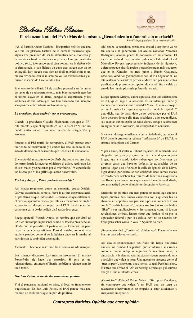 Así está el relanzamiento del PAN: sin ideas, sin caras nuevas, sin rumbo. Un partido que se aferra a sus ruinas como si fueran reliquias sagradas. Y mientras tanto, la ciudadanía y la democracia mexicana siguen esperando una oposición que valga la pena. Una que no se presente como el “menos peor”, sino como una alternativa real. Pero hasta hoy, lo único que ofrece el PAN es nostalgia, reciclaje y discursos que ya ni sus militantes creen.