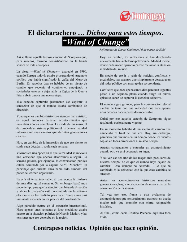 Vivimos en una época en la que la realidad se mueve a una velocidad que apenas alcanzamos a seguir. La semana pasada, por ejemplo, la conversación pública estaba dominada por la captura de “El Mencho”, un personaje que durante años había sido símbolo del poder del crimen organizado.