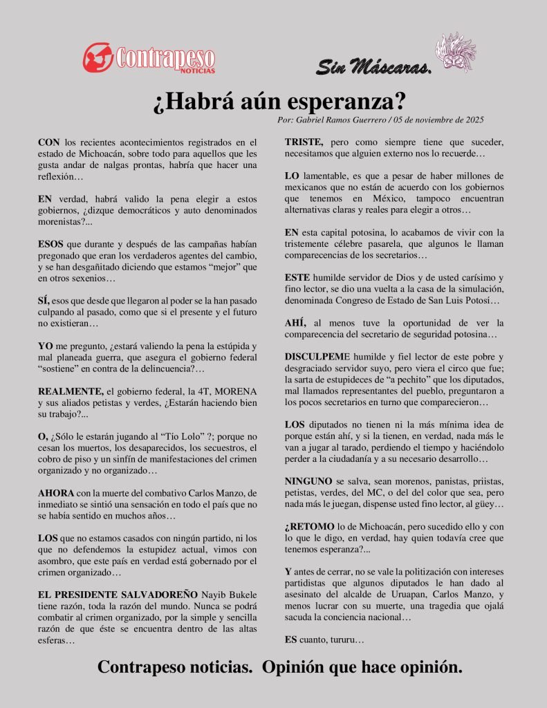 ¿RETOMO lo de Michoacán, pero sucedido ello y con lo que le digo, en verdad, hay quien todavía cree que tenemos esperanza?…