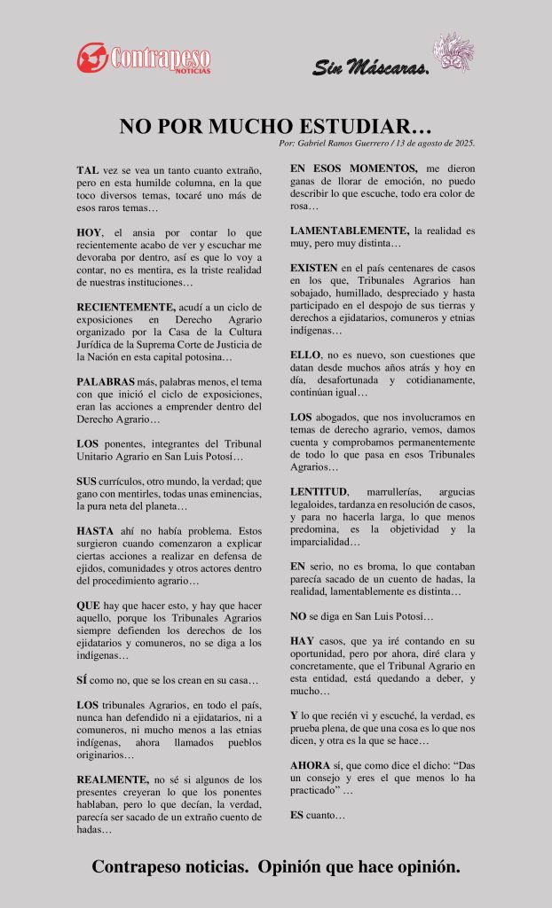 RECIENTEMENTE, acudí a un ciclo de exposiciones en Derecho Agrario organizado por la Casa de la Cultura Jurídica de la Suprema Corte de Justicia de la Nación en esta capital potosina…