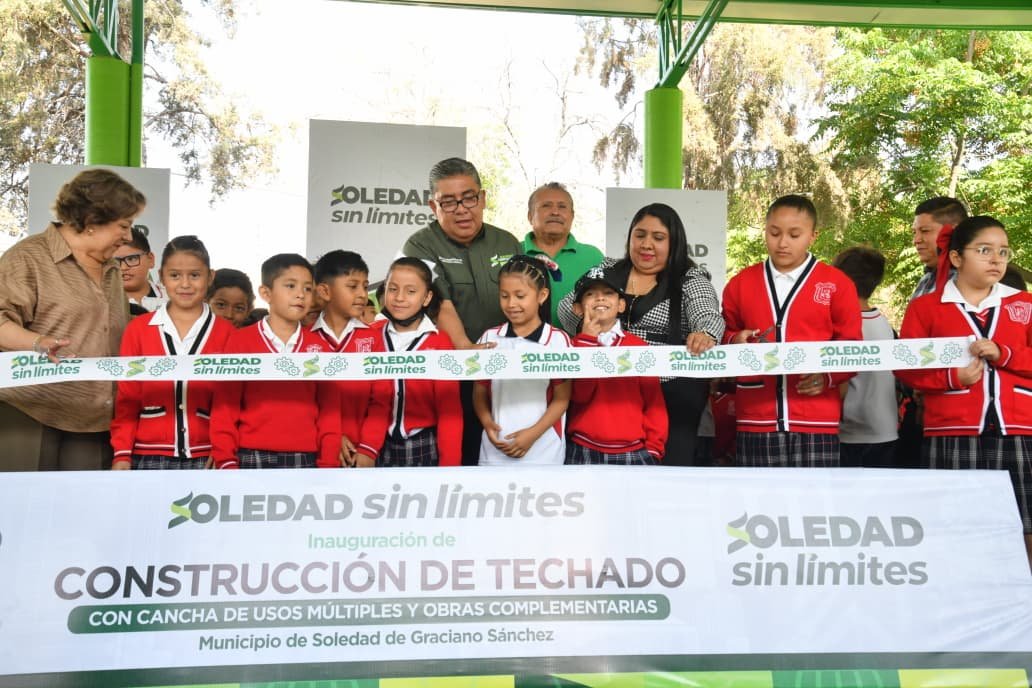 Juan Manuel Navarro Muñiz, Alcalde de Soledad de Graciano Sánchez, inauguró la construcción de un techado con cubierta metálica en la Escuela Primaria “José María Morelos y Pavón”, ubicada en la Unidad Habitacional Pavón, con una inversión estatal superior a los dos millones de pesos, en beneficio de más de 327 estudiantes; la obra, realizada en coordinación con el Gobierno del Estado, corresponde al techado con cubierta metálica de 15 por 27 metros, que incluye pintura de cancha, instalación de postes de voleibol, porterías multifuncionales y alumbrado, fortaleciendo espacios dignos para el desarrollo de niñas y niños, en apego a la visión de cercanía y atención a las familias.
