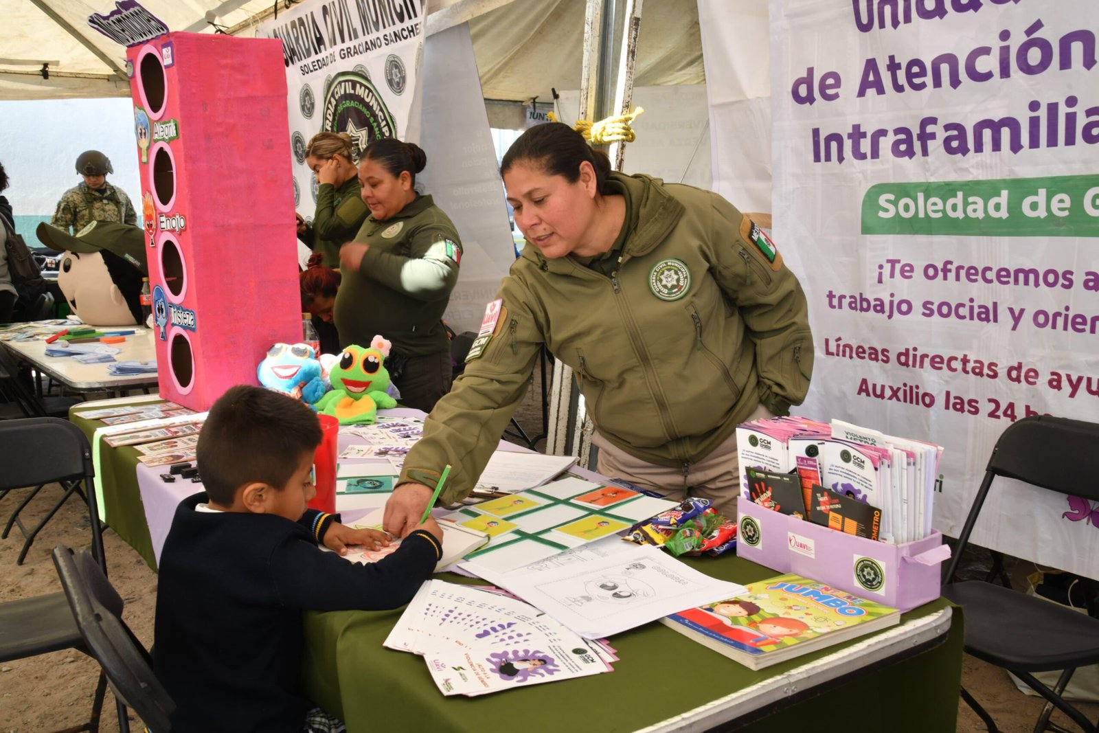 • Guardia Civil Municipal de Soldad de Graciano Sánchez acercó a la colonia San Antonio una Feria de Seguridad con actividades para niñas y niños, orientación para adultos y atención directa a familias, para fortalecer la prevención del delito.