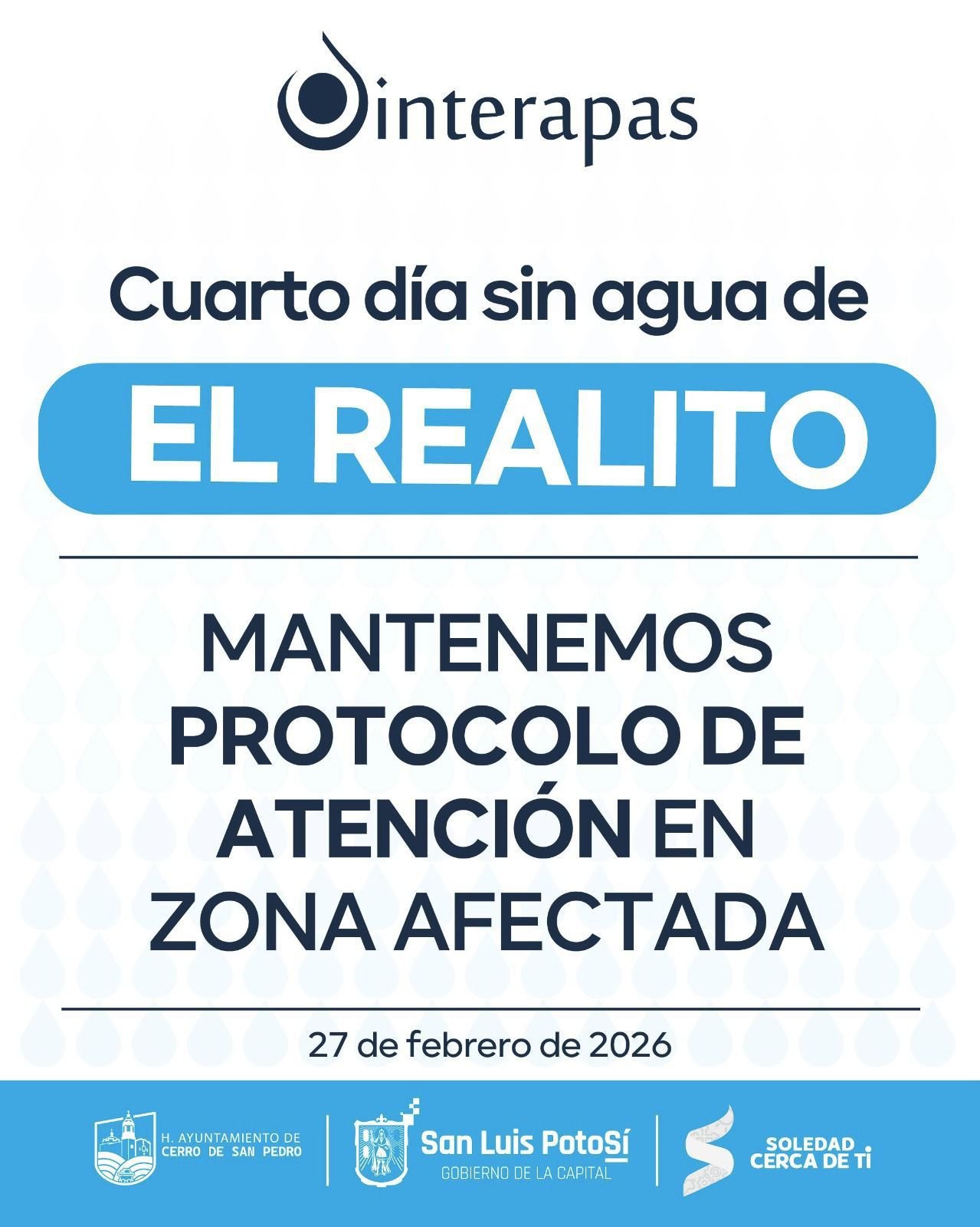 Este viernes se cumplen cuatro días consecutivos sin que llegue agua proveniente del sistema “El Realito”. Ante esta situación, INTERAPAS continúa con su protocolo de atención en las zonas afectadas.