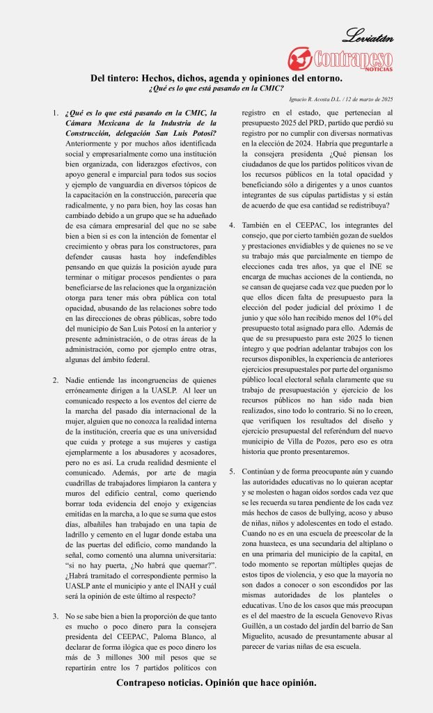 - ¿Qué es lo que está pasando en la CMIC, la Cámara Mexicana de la Industria de la Construcción, delegación San Luis Potosí? Anteriormente y por muchos años identificada social y empresarialmente como una institución bien organizada, con liderazgos efectivos, con apoyo general e imparcial para todos sus socios y ejemplo de vanguardia en diversos tópicos de la capacitación en la construcción, parecería que radicalmente, y no para bien, hoy las cosas han cambiado debido a un grupo que se ha adueñado de esa cámara empresarial del que no se sabe bien a bien si es con la intención de fomentar el crecimiento y obras para los constructores, para defender causas hasta hoy indefendibles pensando en que quizás la posición ayude para terminar o mitigar procesos pendientes o para beneficiarse de las relaciones que la organización otorga para tener más obra pública con total opacidad, abusando de las relaciones sobre todo en las direcciones de obras públicas, sobre todo del municipio de San Luis Potosí en la anterior y presente administración, o de otras áreas de la administración, como por ejemplo entre otras, algunas del ámbito federal.