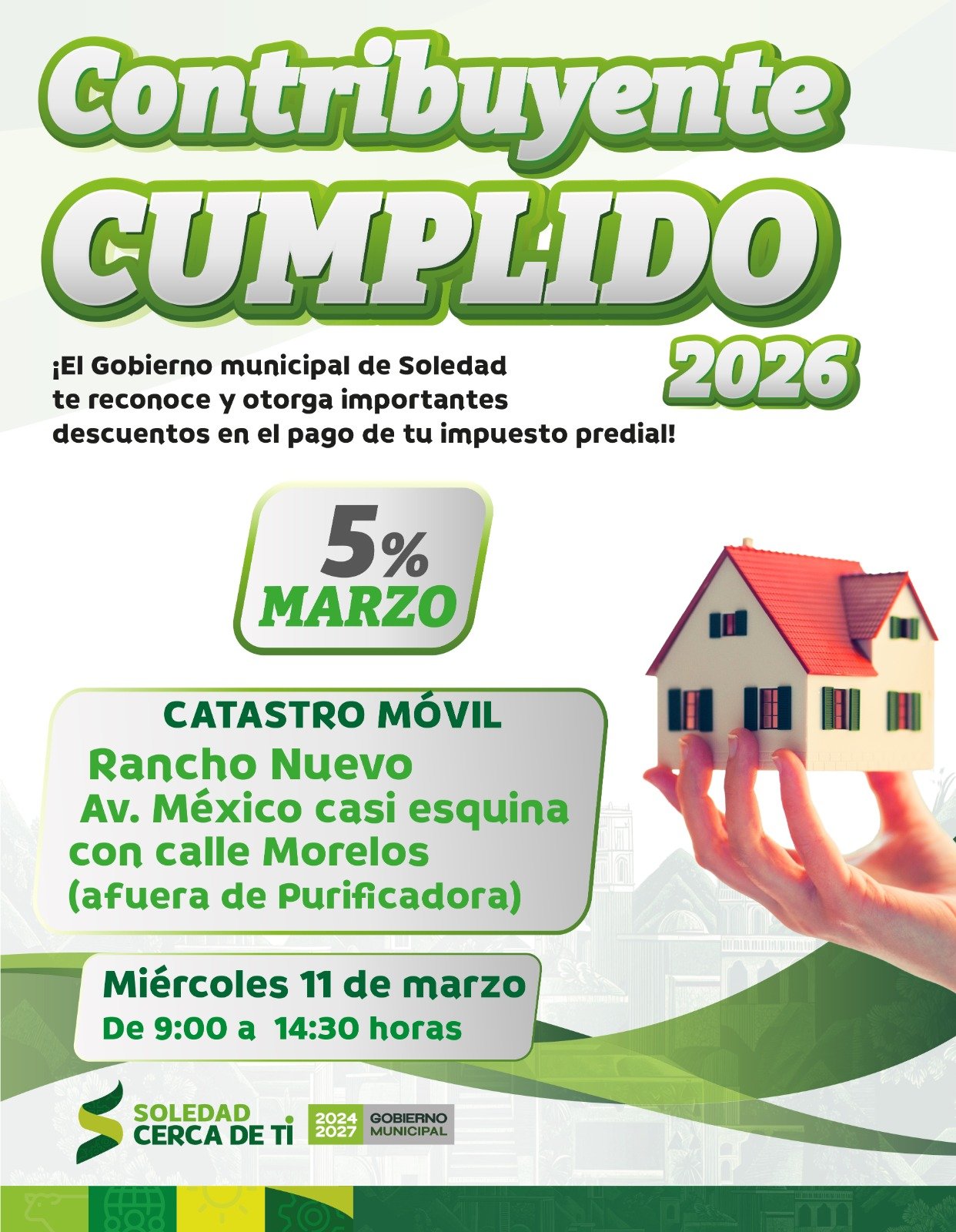 Con el 5 por ciento de descuento vigente durante todo marzo, el Ayuntamiento de Soledad de Graciano Sánchez invita a las y los contribuyentes a aprovechar el último mes de beneficios en el pago del impuesto predial, contribución que permite fortalecer los servicios públicos, impulsar obras de infraestructura y mantener programas municipales cercanos a las familias de todas las colonias y comunidades del municipio.