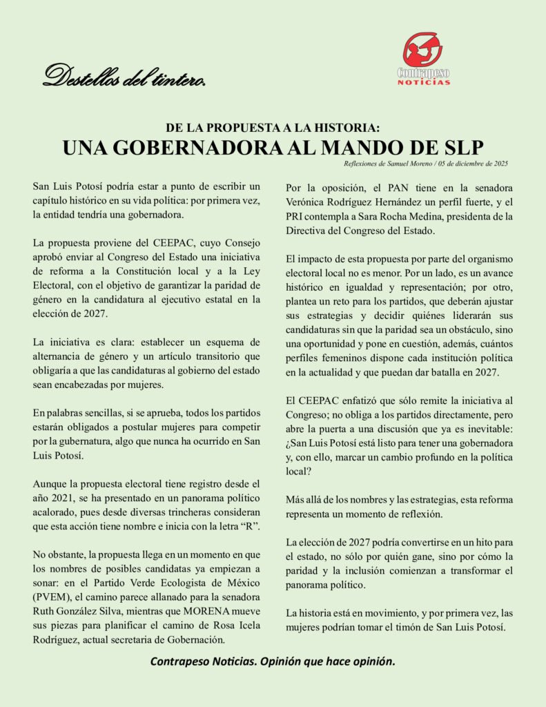 El CEEPAC enfatizó que sólo remite la iniciativa al Congreso; no obliga a los partidos directamente, pero abre la puerta a una discusión que ya es inevitable: ¿San Luis Potosí está listo para tener una gobernadora y, con ello, marcar un cambio profundo en la política local?
