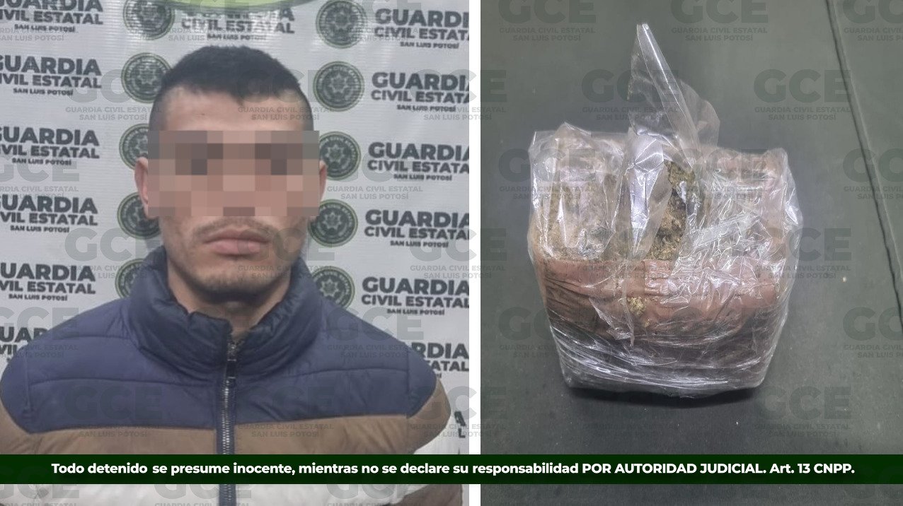 Durante los trabajos de inteligencia que desarrolla la Guardia Civil Estatal en coordinación con personal de la Defensa, un presunto vendedor de estupefacientes fue detenido en la capital potosina, en el Barrio de Tlaxcala.