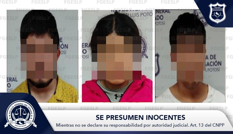 De esta manera, el personal de la FGESLP procedió a la detención de Mayra “N”, Jaime “N” y Juan Francisco “N”, quienes fueron puestos a disposición de un agente del Ministerio Público.