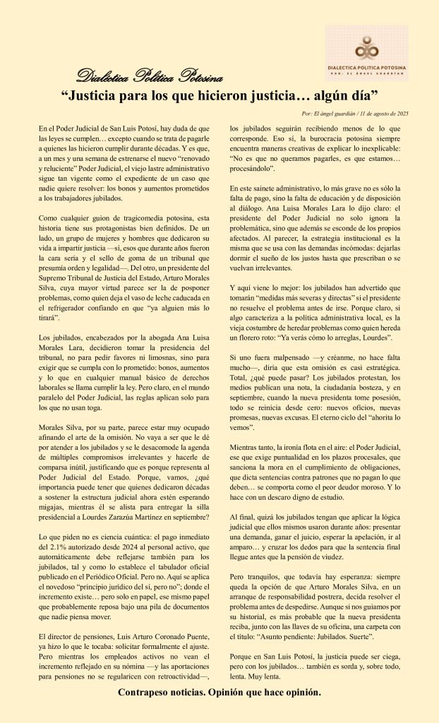 Como cualquier guion de tragicomedia potosina, esta historia tiene sus protagonistas bien definidos. De un lado, un grupo de mujeres y hombres que dedicaron su vida a impartir justicia —sí, esos que durante años fueron la cara seria y el sello de goma de un tribunal que presumía orden y legalidad—. Del otro, un presidente del Supremo Tribunal de Justicia del Estado, Arturo Morales Silva, cuya mayor virtud parece ser la de posponer problemas, como quien deja el vaso de leche caducada en el refrigerador confiando en que “ya alguien más lo tirará”.