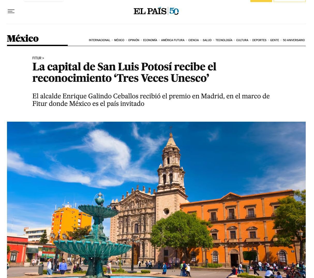 El periódico español El País, uno de los más importantes del mundo, destaca a San Luis Capital por obtener el reconocimiento ‘Tres Veces Unesco’, que recibió el Presidente Municipal Enrique Galindo Ceballos en Madrid, en el marco de la Feria Internacional de Turismo -FITUR-, donde México es el país invitado.