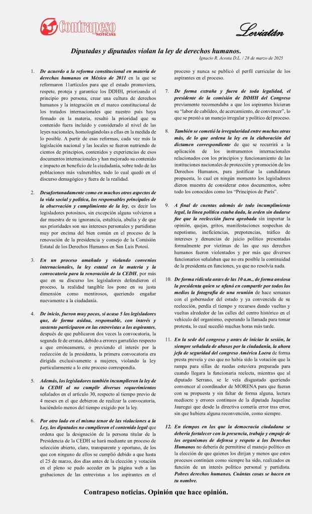 - Desafortunadamente como en muchos otros aspectos de la vida social y política, los responsables principales de la observación y cumplimiento de la ley, es decir los legisladores potosinos, sin excepción alguna volvieron a dar muestra de su ignorancia, estulticia, abulia y de que sus prioridades son sus intereses personales y partidistas muy por encima del bien común en el proceso de la renovación de la presidencia y consejo de la Comisión Estatal de los Derechos Humanos en San Luis Potosí.