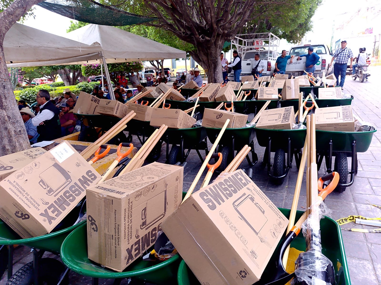 Durante esta jornada, el titular de la dependencia, Jorge Luis Díaz Salinas, realizó la entrega de siete remolques de cama baja y ganaderos, una ensiladora de forraje y granos, dos tractores, dos arados, diversos implementos agrícolas, así como 80 paquetes de herramientas, con el objetivo de fortalecer las labores del campo, mejorar la productividad y contribuir al incremento de ingresos de las familias beneficiarias.