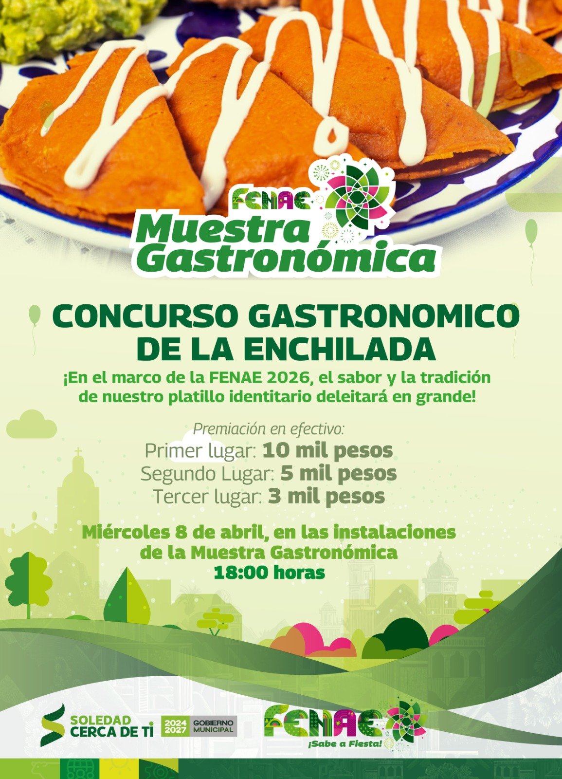 Con el objetivo de fortalecer la identidad culinaria y mantener cercanía con las familias locales y visitantes, el Ayuntamiento de Soledad de Graciano Sánchez invita al Concurso Gastronómico que se realizará el próximo miércoles 08 de abril a las 18:00 horas, en el marco de la Feria Nacional de la Enchilada (FENAE 2026); este certamen ofrecerá una bolsa total de 18 mil pesos en efectivo, destinada a reconocer el talento local en la cocina tradicional, con 10 mil pesos al primer lugar, 5 mil al segundo y 3 mil al tercero.