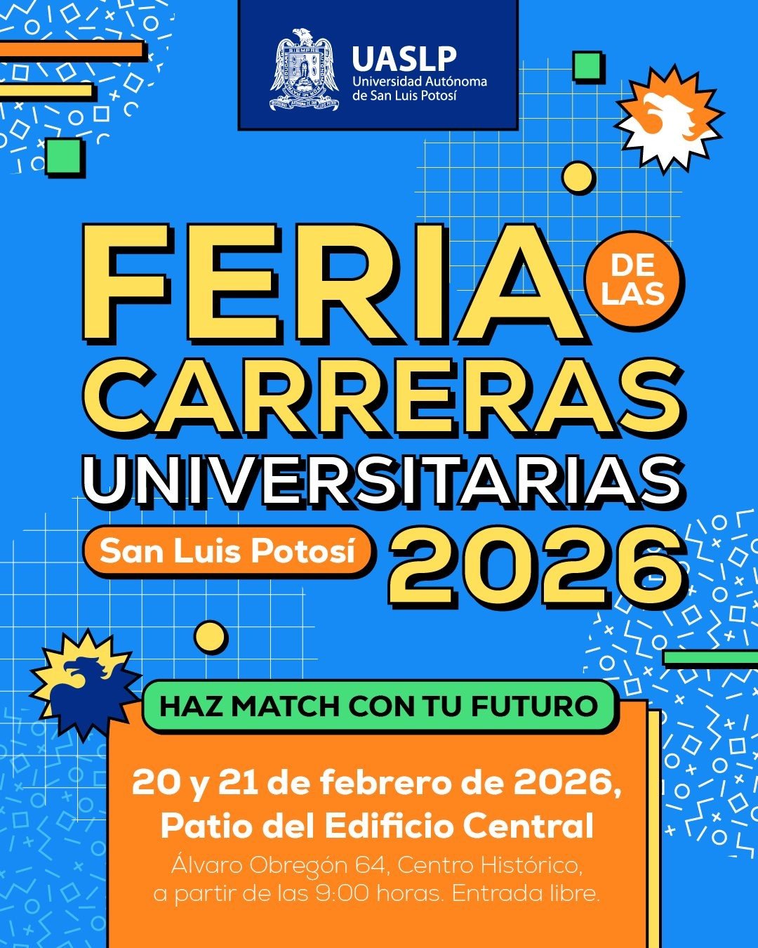 La Feria de las Carreras Universitarias 2026 se llevará a cabo el viernes 20 de febrero, en un horario de 09:00 a 18:00 horas, y el sábado 21 de febrero, de 09:00 a 16:00 horas, en el Edificio Central de la UASLP. La entrada es libre.
