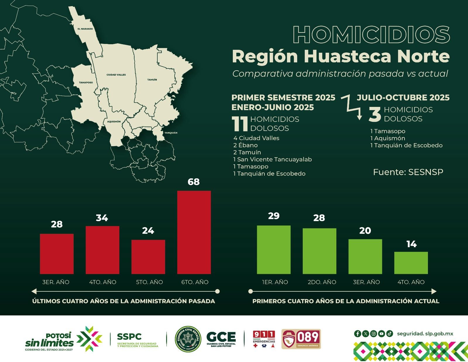 Durante los últimos cuatro años de la administración anterior, se registraron 154 homicidios dolosos en la zona, sin embargo, en los primeros cuatro años de la administración actual, la cifra bajó a 91 casos, lo que acentúa la reducción al analizar el último año de cada periodo: mientras que la administración pasada cerró con 68 homicidios dolosos en su último año, la actual solo reportó 14 en el cuarto año, lo que representa una disminución del 79.41%. Este logro posiciona a San Luis Potosí como una de las entidades más seguras del país.