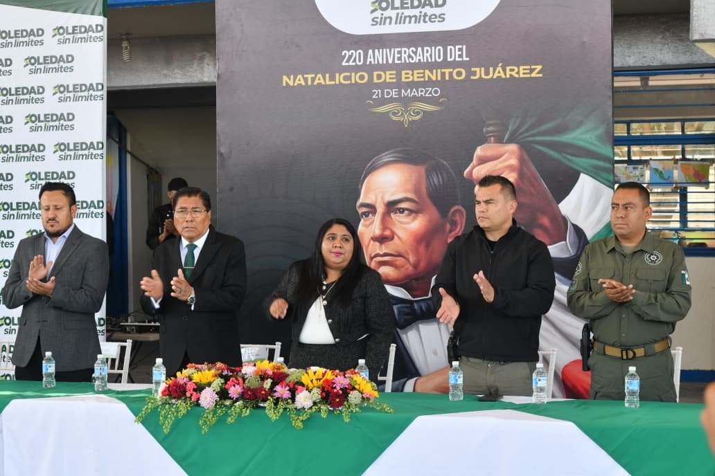 En un emotivo acto cívico y como parte del rescate de los valores que dan identidad a nuestro país, autoridades del Ayuntamiento de Soledad de Graciano Sánchez, encabezadas por la Dirección de Educación y Acción Cívica, conmemoraron el 220 aniversario del natalicio del Benemérito de las Américas, Benito Juárez García, en la explanada de la Secundaria “21 de Marzo de 1806″, donde se reunieron estudiantes, directivos, madres y padres de familia para recordar su legado histórico.