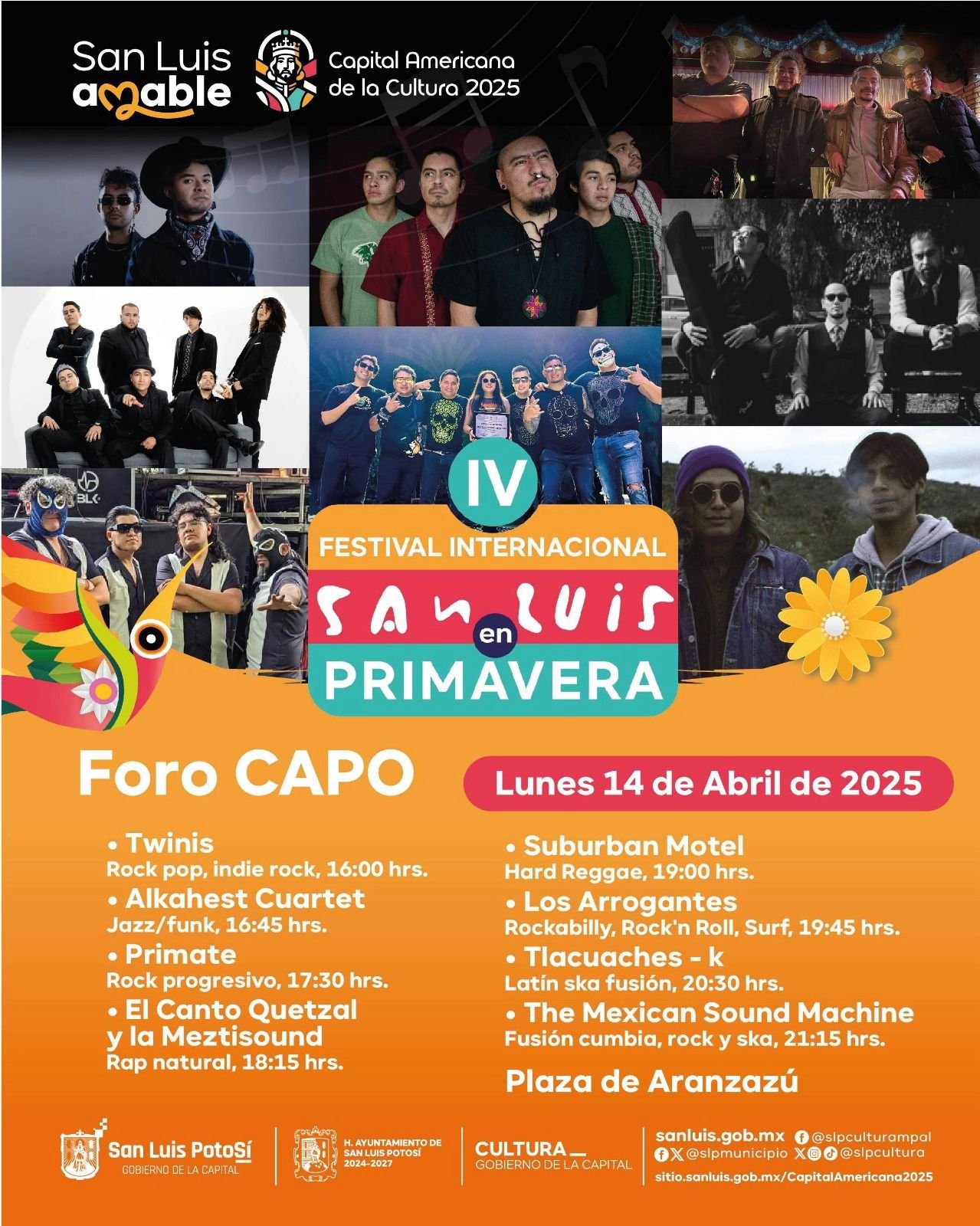 Agregó que este año hay un día dedicado a los artistas potosinos llamado Foro CAPO en la plaza de Aranzazú, mismo que será el lunes 14 de abril de 4 de la tarde a 9 de la noche, y en el que participan 8 agrupaciones locales: Twinis, Alcahest Cuartet, Primate, Canto Quetzal y la Meztisound, Suburban Motel, Los Arrogantes, Tlacuaches-K y The Mexican Sound Machine.