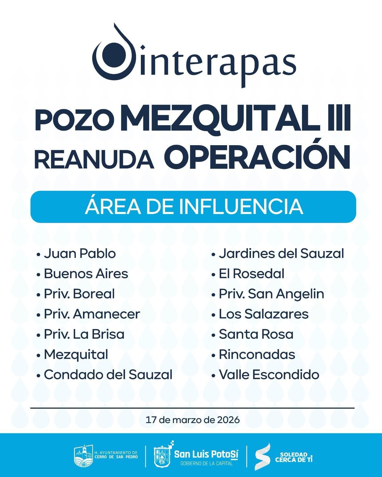 INTERAPAS mantendrá el monitoreo constante de esta fuente de abastecimiento y su funcionamiento, con el fin de asegurar la continuidad del servicio en la zona. Para reportes o mayor información, se encuentra disponible la línea ACUATEL 444 123 6400, así como las redes sociales oficiales del organismo.
