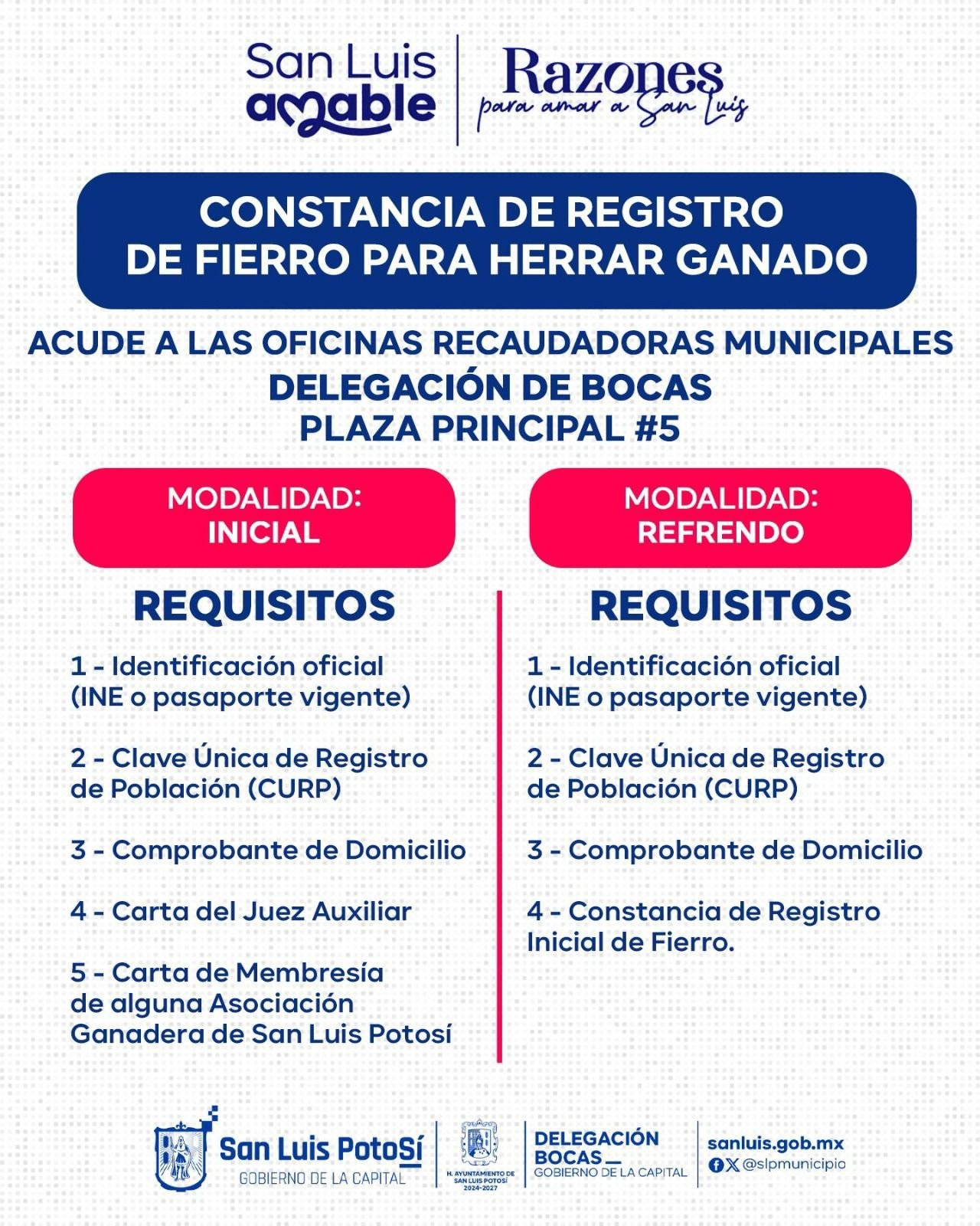 Las oficinas se ubican en la cabecera delegacional en la Plaza Principal, número 5, y entre los requisitos para quienes hacen este trámite por primera vez sobresalen: identificación oficial, CURP, comprobante de domicilio, carta del juez auxiliar y carta de membresía de alguna asociación ganadera de San Luis Potosí.