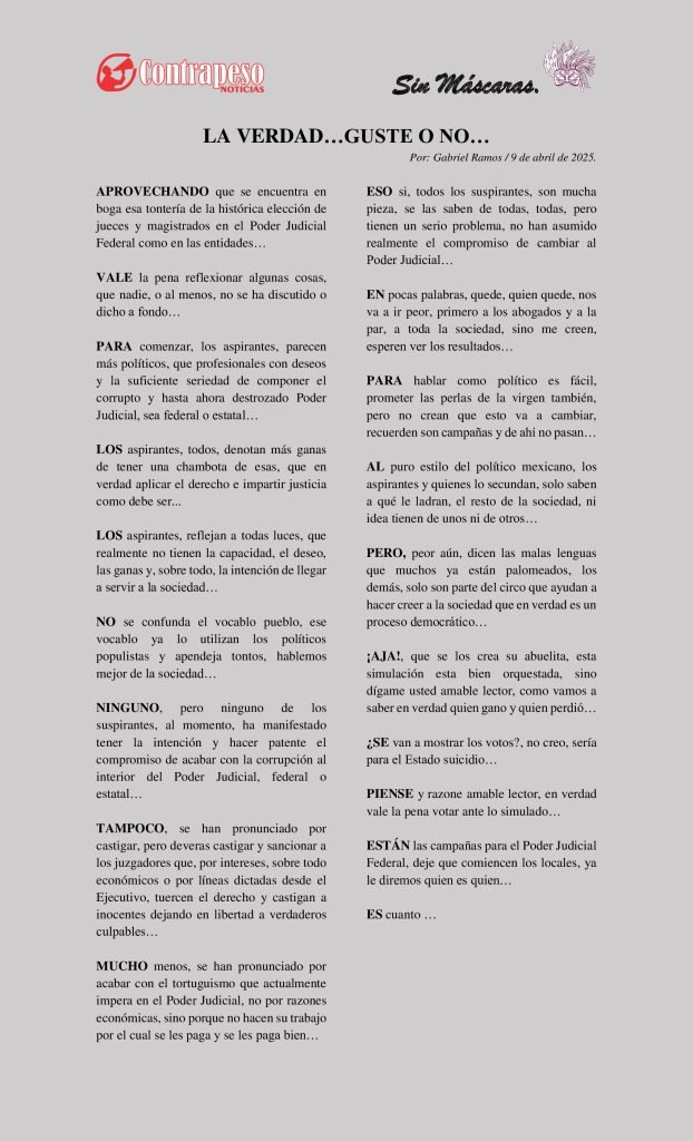PARA comenzar, los aspirantes, parecen más políticos, que profesionales con deseos y la suficiente seriedad de componer el corrupto y hasta ahora destrozado Poder Judicial, sea federal o estatal…