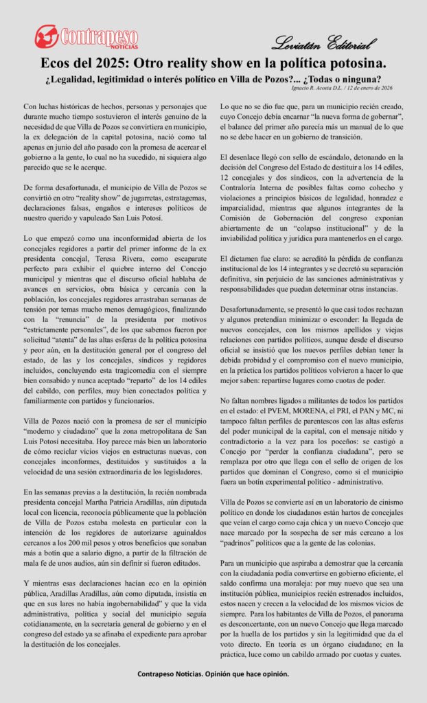 Villa de Pozos nació con la promesa de ser el municipio “moderno y ciudadano” que la zona metropolitana de San Luis Potosí necesitaba. Hoy parece más bien un laboratorio de cómo reciclar vicios viejos en estructuras nuevas, con concejales inconformes, destituidos y sustituidos a la velocidad de una sesión extraordinaria de los legisladores.