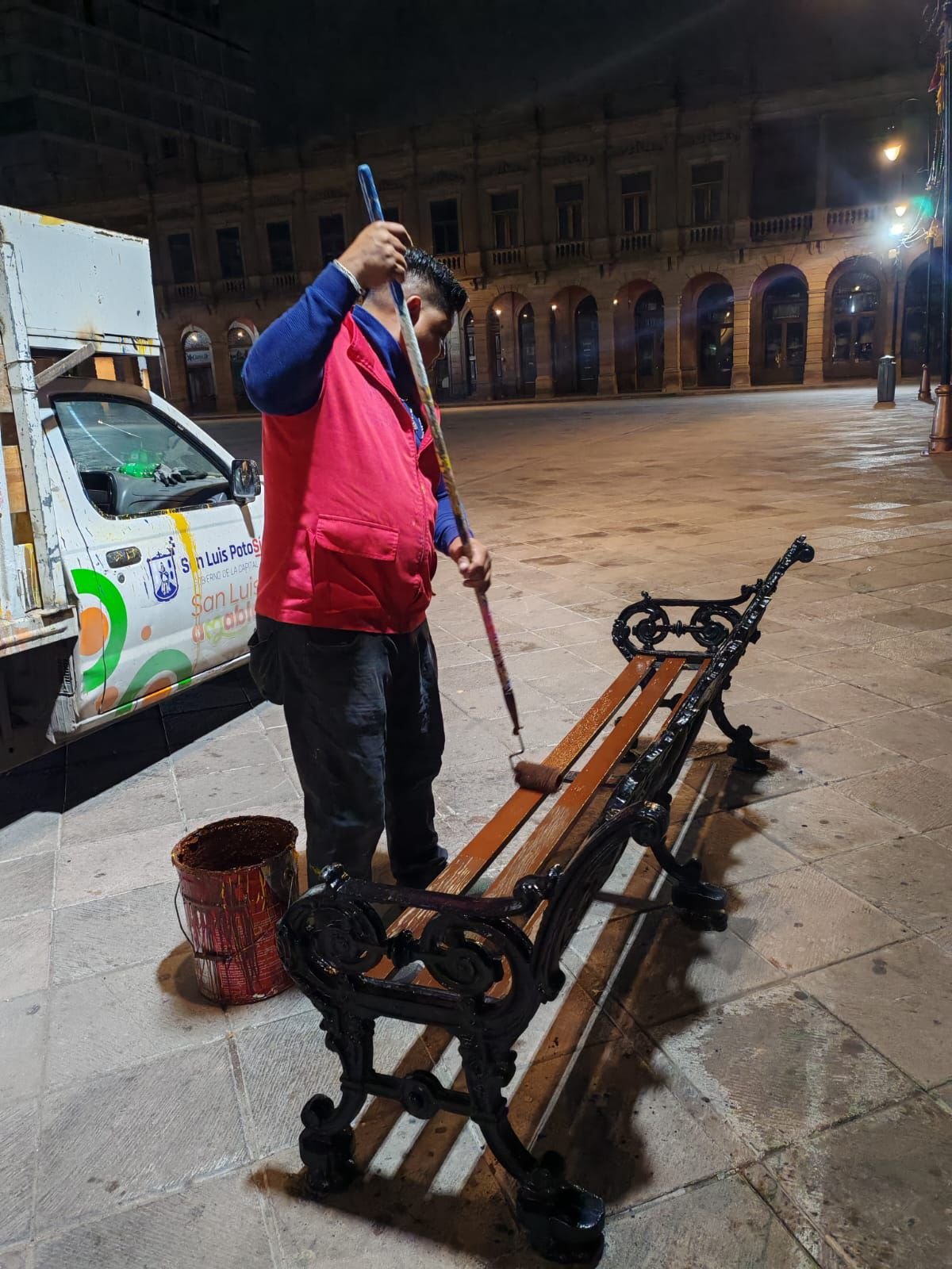 La Dirección de Servicios Municipales del Ayuntamiento capitalino informó que en la Plaza de los Fundadores se repararon y pintaron las bancas que registraban algunos daños; además de hacer una limpieza a fondo con máquinas de hidrolavado para retirar la suciedad acumulada.
