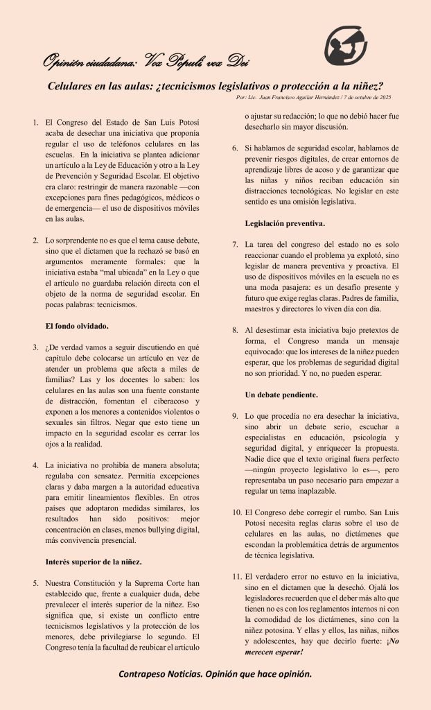 - El Congreso debe corregir el rumbo. San Luis Potosí necesita reglas claras sobre el uso de celulares en las aulas, no dictámenes que escondan la problemática detrás de argumentos de técnica legislativa.
