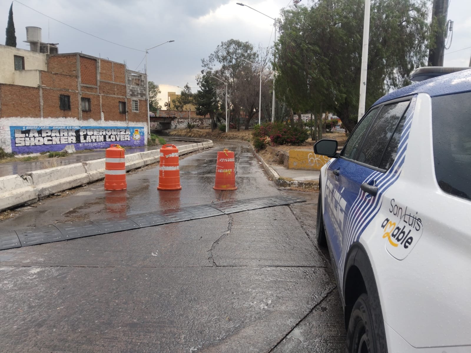 Mediante recorridos preventivos, se realizaron cierres viales en puntos considerados inundables, como el puente Manuel José Othón, el puente Naranja en Acceso Norte y el bulevar Río Españita, con el objetivo de prevenir riesgos y salvaguardar la integridad de automovilistas y peatones.