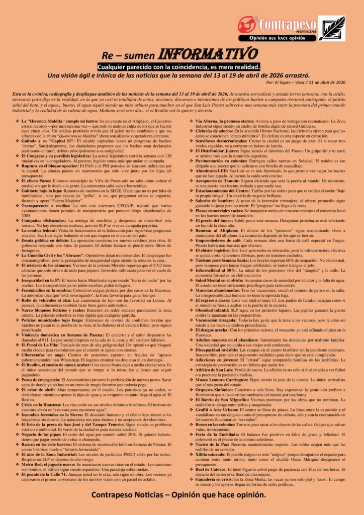 Esta es la crónica, radiografía y despliegue analítico de las noticias de la semana del 13 al 19 de abril de 2026, de nuestra surrealista y amada tierra potosina, con la acidez necesaria para digerir la realidad, en la que ya casi la totalidad de actos, acciones, discursos e intenciones de los políticos huelen a campaña electoral anticipada, el patrón salió del bote, y el agua… bueno, el agua siguió siendo un mito urbano para muchos en el que San Luis Potosí sobrevive una semana más entre la promesa del primer mundo industrial y la realidad de la cubeta de agua. Mañana será otro día… si el Realito así lo quiere y decreta.