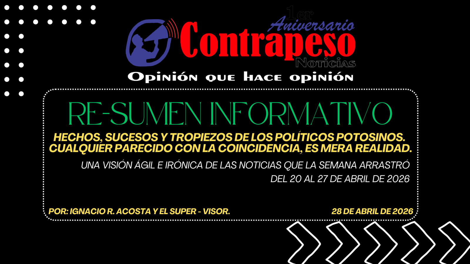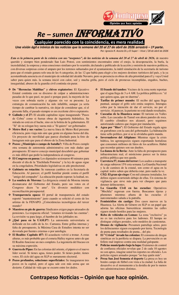 Esta es la primera parte de la crónica con sus “asegunes”, de las noticias de la semana del 20 al 27 de abril de 2026, de nuestro querido y siempre bien ponderado San Luis Potosí, con sentimientos encontrados entre el enojo, la desesperación, la burla, la incredulidad, la sorpresa y otras emociones similares por lo ocurrido, declarado y publicado de la acción y omisión de nuestros políticos, con diversas sorpresas como el amparo por los terrenos subastados por el ayuntamiento, la inútil simulación de la secretaría de turismo para que el estado ganara solo una de las 4 categorías, de las 12 que había para elegir a los mejores destinos turísticos del país, y la ya acostumbrada ausencia en el municipio de soledad del alcalde Navarro, pero su presencia en obras de alta prioridad para él y vaya Usted saber para quien más. la semana inició con calor, sed y mucha grilla, pero el ciclo de promesas incumplidas, engaños, baches, inseguridad, abusos de la guardia civil continúa sin parar.