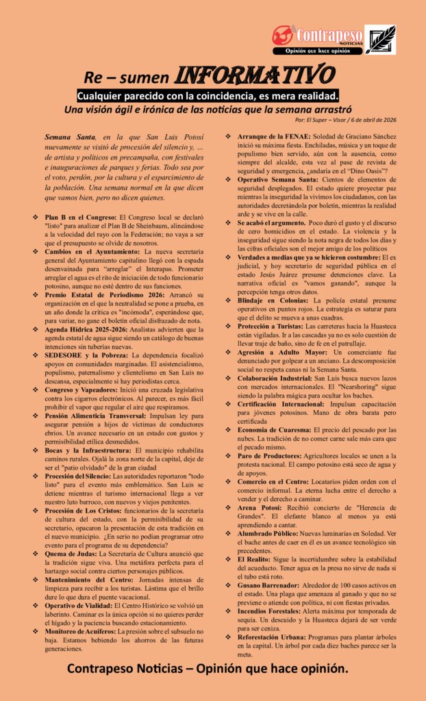 Semana Santa, en la que San Luis Potosí nuevamente se visitó de procesión del silencio y, … de artista y políticos en precampaña, con festivales e inauguraciones de parques y ferias. Todo sea por el voto, perdón, por la cultura y el esparcimiento de la población. Una semana normal en la que dicen que vamos bien, pero no dicen quienes.