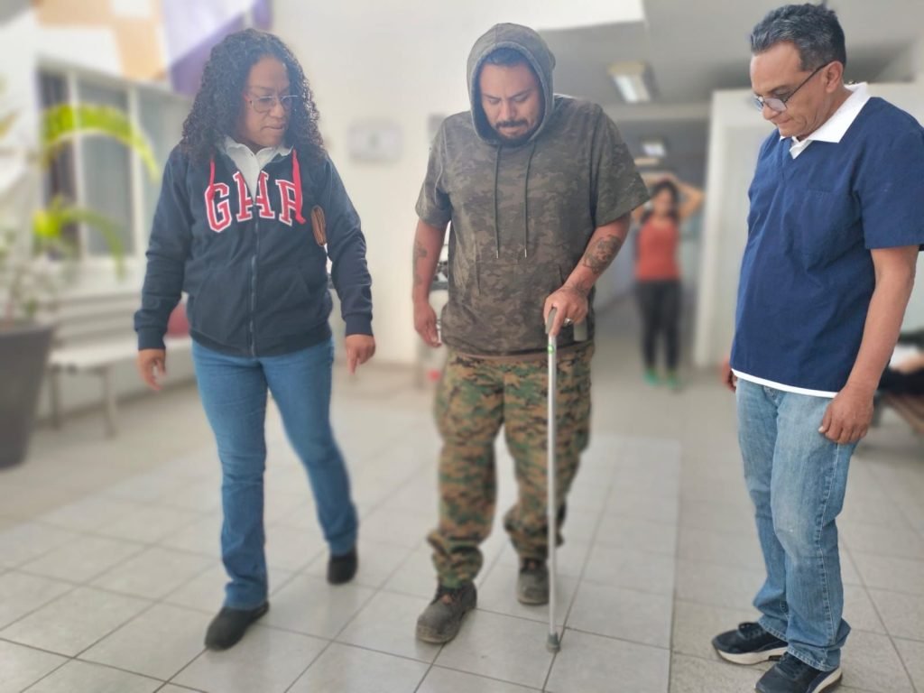 Con más confianza, ahora apoyado en un bastón, da pasos tal y como se lo indican los terapeutas desde hace un mes, pues ya camina y ahora debe retomar postura y fortaleza a lo que dice, ha sido un avance muy rápido.