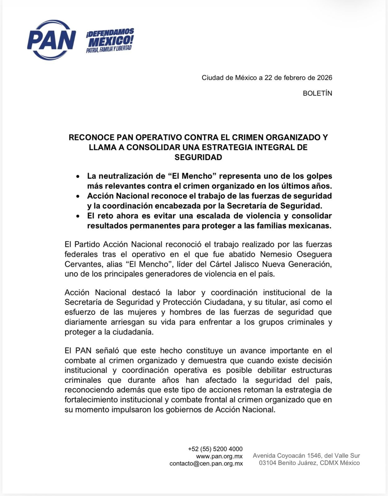 El PAN señaló que este hecho constituye un avance importante en el combate al crimen organizado y demuestra que cuando existe decisión institucional y coordinación operativa es posible debilitar estructuras criminales que durante años han afectado la seguridad del país, reconociendo además que este tipo de acciones retoman la estrategia de fortalecimiento institucional y combate frontal al crimen organizado que en su momento impulsaron los gobiernos de Acción Nacional.
