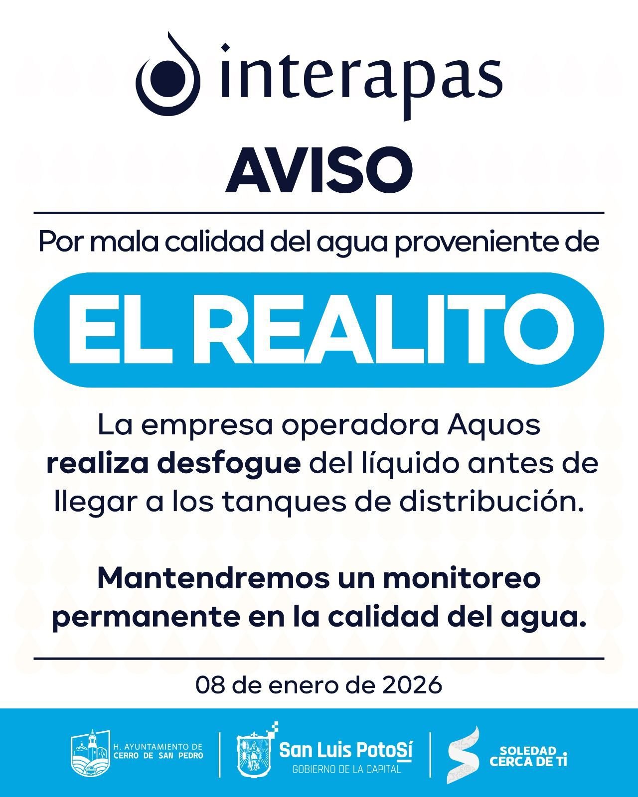SLP.- Ante la detección de agua que no cumple con los parámetros de la norma oficial para consumo humano, la empresa Aquos, responsable de operar el sistema “El Realito” informó que suspenderá temporalmente el envío de agua y realizará desfogues intermitentes en la línea de conducción.