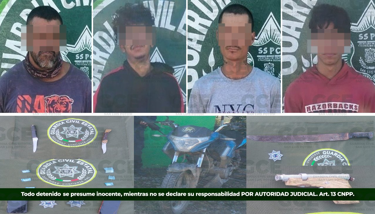 Mediante las labores de seguridad, efectuadas en la región Huasteca, para preservar la tranquilidad de sus habitantes, nuestros agentes de la Guardia Civil Estatal detuvieron a cuatro presuntos por asociación delictuosa, portación de armas prohibidas y posesión de droga.