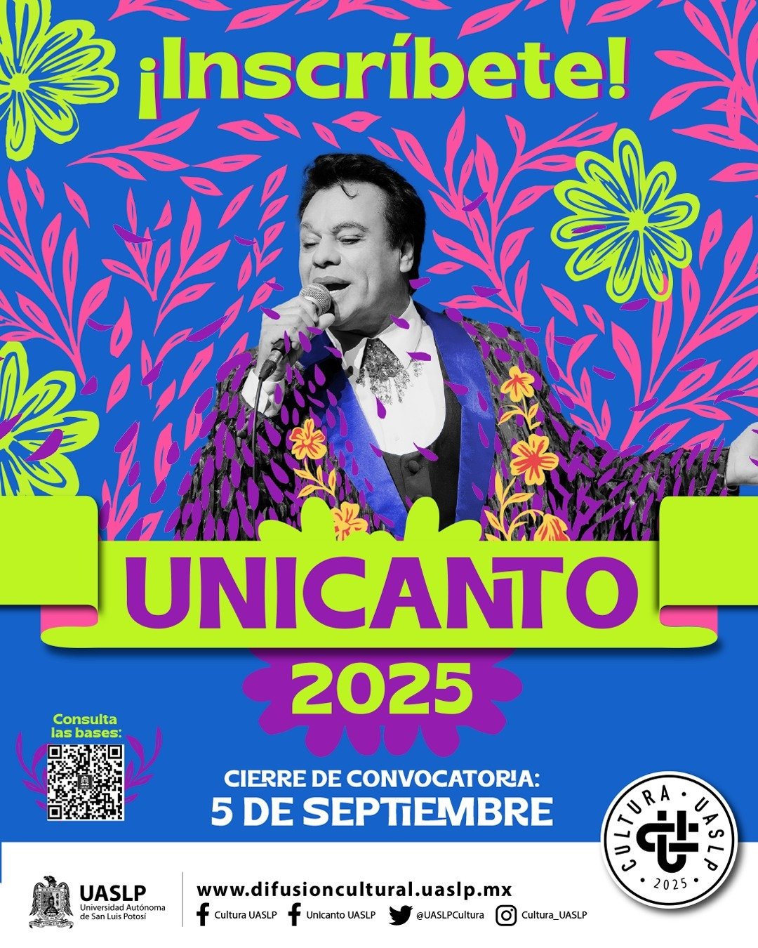 La Universidad Autónoma de San Luis Potosí (UASLP), a través de la Secretaría de Difusión Cultural, lanzó la convocatoria para que personal administrativo, de servicio, docentes y estudiantes participen en el concurso Unicanto 2025, que este año rinde homenaje al reconocido artista mexicano Juan Gabriel.
