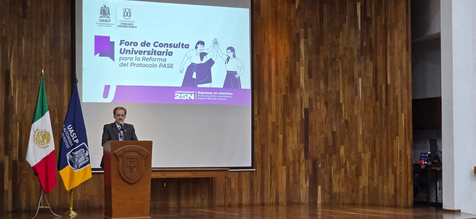 En representación del doctor Alejandro Javier Zermeño, rector de la UASLP, el maestro Jorge Alberto Pérez González, secretario académico, señaló que la institución atraviesa un momento decisivo tras hechos que nunca debieron ocurrir. Expuso que no basta condenar la violencia, sino que se debe erradicar, y destacó la importancia de aplicar de manera efectiva el protocolo universitario. Comentó que la universidad analizó la situación en todas sus entidades académicas y detectó temas prioritarios como seguridad, justicia, equidad, transparencia y bienestar, con énfasis en la atención y prevención de la violencia de género.